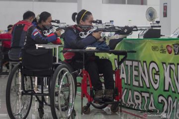 Atlet menembak National Paralympic Committee (NPC), Hanik Pujiastuti (kanan) mengikuti pemusatan latihan (pelatnas) di Hartono Trade Center, Grogol, Sukoharjo, Jawa Tengah, Senin (10/02/2020). Latihan tersebut untuk persiapan Asean Para Games 2020 di Filipina Maret mendatang. ANTARA FOTO/Mohammad Ayudha/hp.