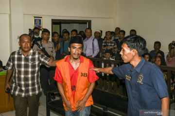 Terdakwa kasus pembunuhan sopir taksi daring Akbar Alfaris menjalani sidang putusan di Pengadilan Negeri (PN) Kelas I A Palembang, Sumatera Selatan, Kamis (13/2/2020). Majelis Hakim menjatuhkan hukuman mati terhadap terdakwa yang merupakan otak pelaku pembunuhan sopir taksi daring di Kota Palembang bernama Sofyan pada Oktober 2018 yang lalu. ANTARA FOTO/Nova Wahyudi/foc.