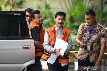 Tersangka Mantan Bupati Solok Selatan Sumatera Barat Muzni Zakaria (kedua kanan) dan mantan anggota DPRD Kota Bandung Tomtom Dabbul Qomar (kiri) berjalan memasuki ruangan untuk menjalani pemeriksaan di Gedung KPK, Jakarta, Jumat (14/2/2020). KPK memeriksa Muzni Zakaria sebagai tersangka terkait kasus dugaan suap proyek pembangunan infrastruktur Jembatan Ambayan dan Masjid Agung di Solok Selatan, sementara Tomtom Dabbul Qomar diperiksa terkait suap pengadaan tanah untuk Ruang Terbuka Hijau (RTH) di Pemerintah Kota Bandung pada tahun 2012 dan 2013 yang menyebabkan kerugian keuangan negara sebesar Rp69 miliar. ANTARA FOTO/M Risyal Hidayat/aww.