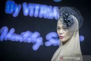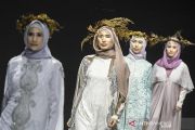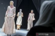 Model mengenakan busana rancangan Vitria pada Indonesia Muslim Fashion Festival (MUFFEST) 2020 di Jakarta Convention Center, Jakarta, Rabu (20/2/2020). MUFEST 2020 yang bertema 'Sustainable Fashion' diselenggarakan 20-23 Februari 2020. ANTARA FOTO/Galih Pradipta/pras.