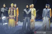 Model mengenakan busana rancangan Wignyo Rahadi pada Indonesia Muslim Fashion Festival (MUFFEST) 2020 di Jakarta Convention Center, Jakarta, Rabu (20/2/2020). MUFEST 2020 yang bertema 'Sustainable Fashion' diselenggarakan 20-23 Februari 2020. ANTARA FOTO/Galih Pradipta/pras.