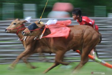 Joki memacu sapi kerapan di Desa Durbuk, Pamekasan, Jawa Timur, Jumat (21/2/2020). Kerapan yang diperuntukkan bagi sapi pemula itu diikuti puluhan pasang sapi dari Sampang, Pamekasan dan Sumenep. ANTARA FOTO/Saiful Bahri/hp.