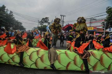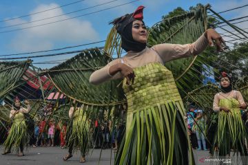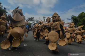 Peserta karnaval mengikuti Banjar karnaval budaya pada di Jalan Letjen Suwato, Kota Banjar, Jawa Barat, Sabtu (22/2/2020). Kegiatan Banjar karnval budaya yang diikuti 25 Desa Kelurahan sebagai salah satu media promosi memperkenalkan seni budaya, industri kreatif dan perdagangan di Kota Banjar dengan menampilkan ciri khas potensi desa. ANTARA FOTO/Adeng Bustomi/hp.