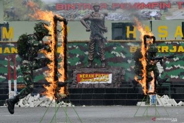 Prajurit TNI AD melakukan atraksi melewati rintangan api pada penutupan Pendidikan Pertama Bintara di Lapangan Sapta Marga Mako Rindam XIV Hasanuddin, Pakkato, Kabupaten Gowa, Sulawesi Selatan, Sabtu (22/2/2020). Sebanyak 254 prajurit TNI AD dinyatakan lulus menyelesaikan pendidikan militer pertama bintara dengan pangkat sersan dua. ANTARA FOTO/Abriawan Abhe/hp.