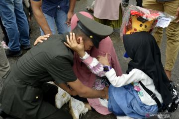 Seorang prajuri TNI AD memeluk ibunya usai penutupan Pendidikan Pertama Bintara di Lapangan Sapta Marga Mako Rindam XIV Hasanuddin, Pakkato, Kabupaten Gowa, Sulawesi Selatan, Sabtu (22/2/2020). Sebanyak 254 prajurit TNI AD dinyatakan lulus menyelesaikan pendidikan militer pertama bintara dengan pangkat sersan dua. ANTARA FOTO/Abriawan Abhe/hp.