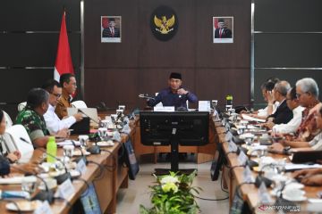 Menko PMK Muhadjir Effendy (kiri atas) memimpin Rapat Koordinasi Tingkat Menteri di Jakarta, Senin (24/2/2020). Rakor itu membahas rencana pemulangan WNI ABK kapal pesiar World Dream. ANTARA FOTO/Akbar Nugroho Gumay/hp.