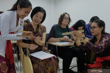 Praktisi Bahasa Bali memberikan penjelasan kepada perwakilan dari Konsul Jenderal China Sun Lihua (kedua kiri) dan Konsul Jenderal Australia Anthea Griffin (ketiga kanan) saat pelajaran menulis aksara Bali di atas daun lontar dalam rangkaian pameran pustaka lontar di Denpasar, Bali, Kamis (27/2/2020). Kegiatan tersebut melibatkan sejumlah konsul jenderal negara sahabat untuk memperkenalkan budaya dan sastra Bali yang kini terus dilestarikan. ANTARA FOTO/Nyoman Hendra Wibowo/nym/hp.
