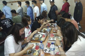 Sejumlah WNI kru kapal World Dream menyantap makanan di KRI dr Soeharso ketika menuju lokasi observasi COVID-19 Pulau Sebaru Kecil, Kepulauan Seribu, Kamis (27/2/2020). ANTARA FOTO/HO/Dispenal/wpa/hp.