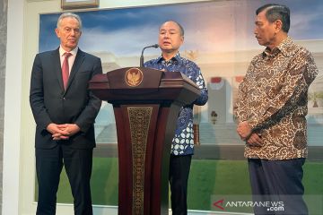 Menko Kemaritiman dan Investasi Luhut Binsar Panjaitan dan mantan Perdana Menteri Inggris Tonny Blair memperhatikan penjelasan CEO Softbank Masayoshi Son saat jumpa pers di Istana Merdeka Jakarta, Jumat (28/2/2020). Kedua tamu khusus tersebut datang untuk bertemu Presiden Joko Widodo dengan agenda utama membahas rencana pembangunan ibu kota baru Republik Indonesia. ANTARA/Hanni Sofia/aa.
