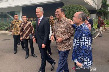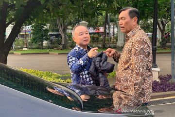 Menko Kemaritiman dan Investasi Luhut Binsar Panjaitan berbincang dengan CEO Softbank Masayoshi Son di halaman Istana Merdeka Jakarta, Jumat (28/2/2020). Masayoshi Son datang bersama mantan Perdana Menteri Inggris Tonny Blair untuk bertemu Presiden Joko Widodo dengan agenda utama membahas rencana pembangunan ibu kota baru Republik Indonesia. ANTARA/Hanni Sofia/aa.
