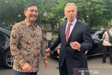 Menko Kemaritiman dan Investasi Luhut Binsar Panjaitan berbincang dengan mantan Perdana Menteri Inggris Tonny Blair di halaman Istana Merdeka Jakarta, Jumat (28/2/2020). Tonny Blair datang bersama CEO Softbank Masayoshi Son untuk bertemu Presiden Joko Widodo dengan agenda utama membahas rencana pembangunan ibu kota baru Republik Indonesia. ANTARA/Hanni Sofia/aa.