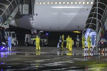 WNI kru kapal pesiar Diamond Princess yang dinyatakan negatif virus corona tiba di Bandara Kertajati, Kabupaten Majalengka, Jawa Barat, Senin (2/3/2020) dini hari. Pemerintah mengevakuasi 69 WNI kru kapal pesiar Diamond Princess dari Yokohama, Jepang dan selanjutnya akan menjalani proses observasi di Pulau Sebaru Kecil, Kepulauan Seribu, Jakarta. ANTARA FOTO/Muhammad Adimaja/wsj.