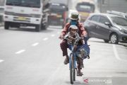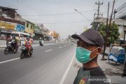 Warga beraktivitas dengan mengenakan masker saat hujan abu di Kartasura, Sukoharjo, Jawa Tengah, Selasa (3/3/2020). Hujan abu akibat erupsi gunung Merapi yang terjadi pada pukul 05.22 WIB dengan tinggi kolom 6 kilometer menyebabkan hujan abu di sejumlah wilayah di Boyolali, Sukoharjo hingga Solo. ANTARA FOTO/Mohammad Ayudha/pras.