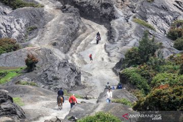 Wisatawan mendaki ke kawah Gunung Bromo di Kecamatan Sukapura, Probolinggo, Jawa Timur, Kamis (5/3/2020). Berdasar laporan Balai Besar Taman Nasional Bromo Tengger Semeru (BBTNBTS) selama sebulan terakhir kunjungan wisatawan mancanegara terutama dari Tiongkok menurun hingga 60 persen lebih akibat penyebaran virus corona. ANTARA FOTO/Umarul Faruq/aww.