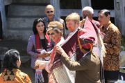 Raja Belanda Willem Alexander bersama Ratu Maxima Zorreguieta Cerruti (tengah) didampingi Menteri Koordinator Bidang Kemaritiman dan Investasi Luhut Binsar Pandjaitan (kanan) diulosin dengan kain ulos Pinunsaan ketika disambut oleh masyarakat Batak di Dusun Siambat Dalan, Desa Lintong Nihuta, Kecamatan Tampahan, Kabupaten Toba, Sumatera Utara, Kamis (12/3/2020). Selain berwisata di Danau Toba, Raja dan Ratu Belanda juga mengunjungi rumah adat Batak yang usianya sudah mencapai ratusan tahun sekaligus bersilahturahmi bersama masyarakat. ANTARA FOTO/Septianda Perdana/ama.