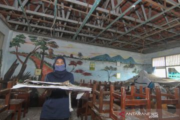 Sejumlah guru membersihkan puing-puing langit-langit atap yang ambruk di SD Kemiri Muka 1, Depok, Jawa Barat, Selasa (17/3/2020). Hujan dengan intensitas tinggi disertai angin kencang pada Senin (16/3) mengakibatkan kerusakan pada tiga kelas bagian atap SD Kemiri Muka 1 Depok. ANTARA FOTO/Asprilla Dwi Adha/pras.