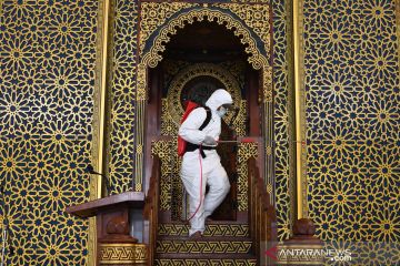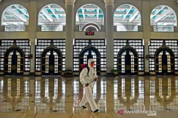 Petugas Badan Penanggulangan Bencana Daerah (BPBD) Jatim menyemprotkan cairan disinfektan di Masjid Nasional Al Akbar Surabaya, Jawa Timur, Selasa (17/3/2020). Kegiatan tersebut dilakukan untuk mencegah penyebaran virus corona (COVID-19). ANTARA FOTO/Zabur Karuru/pras.