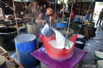 Perajin membuat tahu di salah satu industri tahu, Desa Geucheu, Banda Aceh, Aceh, Jumat (20/3/2020). Menurut Asosiasi Perajin Tahu dan Tempe di daerah itu, produksi tahu menurun tajam hingga 65 persen akibat harga bahan baku kedelai impor naik tajam dari Rp7.200 menjadi Rp8.300 per kilogram menyusul melemahnya nilai tukar rupiah terhadap dolar AS. ANTARA FOTO/Ampelsa/wsj.
