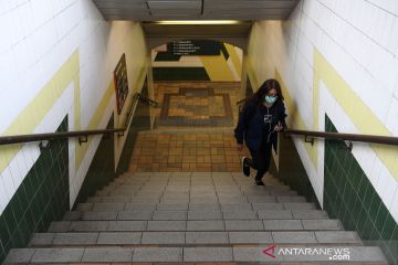 Seorang penumpang menggunakan masker keluar dari stasiun kereta saat wabah COVID-19 merebak di Sydney, Australia, Selasa (24/3/2020). ANTARA FOTO/REUTERS/Loren Elliott/pras.