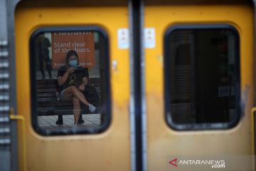 Seorang penumpang menggunakan masker duduk sendirian menunggu kereta saat wabah COVID-19 merebak di Sydney, Australia, Selasa (24/3/2020). ANTARA FOTO/REUTERS/Loren Elliott/pras.
