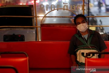 Seorang pria dengan menggunakan masker duduk di dalam bus saat wabah COVID-19 mulai merebak di Bangkok, Thailand, Kamis (26/3/2020). Pemerintah Thailand memberlakukan status darurat nasional mulai 26 Maret - 30 April 2020 antara lain adanya larangan masuk ke negara tersebut untuk membendung penyebaran COVID-19. ANTARA FOTO/REUTERS/Jorge Silva/pras.