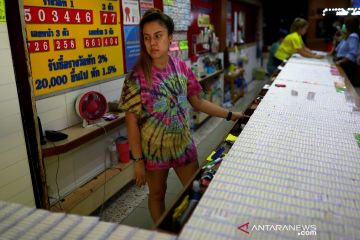 Seorang wanita menjual tiket lotere di Bangkok, Thailand, Kamis (26/3/2020). Pemerintah Thailand memberlakukan status darurat nasional mulai 26 Maret - 30 April 2020 antara lain adanya larangan masuk ke negara tersebut untuk membendung penyebaran COVID-19. ANTARA FOTO/REUTERS/Soe Zeya Tun/pras.