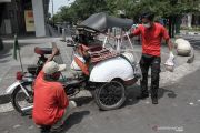 Relawan membagikan paket sembako kepada tukang becak di kawasan Malioboro, DI Yogyakarta, Jumat (27/3/2020). Pemberian bantuan sebagai jaring pengaman ekonomi bagi warga dengan pekerjaan mengandalkan pendapatan harian sebagai tukang becak, kusir andong dan pedagang kaki lima kawasan Malioboro seiring terus dilakukannya physical distancing untuk mencegah penyebaran COVID-19. ANTARA FOTO/Hendra Nurdiyansyah/foc.