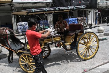 Relawan membagikan paket sembako kepada kusir di kawasan Malioboro, DI Yogyakarta, Jumat (27/3/2020). Pemberian bantuan sebagai jaring pengaman ekonomi bagi warga dengan pekerjaan mengandalkan pendapatan harian sebagai tukang becak, kusir andong dan pedagang kaki lima kawasan Malioboro seiring terus dilakukannya physical distancing untuk mencegah penyebaran COVID-19. ANTARA FOTO/Hendra Nurdiyansyah/foc.