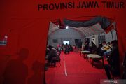 Sejumlah wartawan meliput melalui monitor televisi, konferensi pers tentang perkembangan Virus Corona, di tenda wartawan, di halaman Gedung Negara Grahadi, Surabaya, Jawa Timur, Jumat (27/3/2020). Untuk mencegah penyebaran Virus Corona (COVID-19), Pemprov Jatim menyiarkan secara langsung konferensi pers di tenda wartawan untuk diliput para awak media dan membatasi wartawan untuk melakukan peliputan di ruangan konferensi pers. ANTARA FOTO/Zabur Karuru/hp.