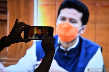 Sejumlah wartawan meliput melalui monitor televisi, keterangan pers Wakil Gubernur Jawa Timur Emil Dardak tentang perkembangan Virus Corona, di tenda wartawan, di halaman Gedung Negara Grahadi, Surabaya, Jawa Timur, Jumat (27/3/2020). Untuk mencegah penyebaran Virus Corona (COVID-19), Pemprov Jatim menyiarkan secara langsung konferensi pers di tenda wartawan untuk diliput para awak media dan membatasi wartawan untuk melakukan peliputan di ruangan konferensi pers. ANTARA FOTO/Zabur Karuru/hp.