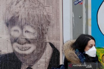Seorang wanita yang mengenakan masker berjalan melewati poster Perdana Menteri Inggris Boris Johnson, saat wabah virus corona (COVID-19) di Manchester, Inggris, Senin (30/3/2020). ANTARA FOTO/REUTERS/Phil Noble/aww.