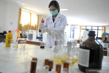 Seorang dosen membuat Hand Sanitizer atau cairan pembersih tangan dari bahan minuman Arak Bali di Universitas Udayana, Badung, Bali, Kamis (2/4/2020). Polda Bali bekerja sama dengan Universitas Udayana melakukan pengolahan Arak Bali yang diperoleh dari masyarakat untuk dijadikan Hand Sanitizer yang akan dibagikan secara gratis kepada masyarakat untuk mengantisipasi penyebaran COVID-19. ANTARA FOTO/Fikri Yusuf/hp.