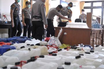 Petugas kepolisian menuangkan Hand Sanitizer atau cairan pembersih tangan dari bahan minuman Arak Bali ke kemasan untuk diedarkan di Universitas Udayana, Badung, Bali, Kamis (2/4/2020). Polda Bali bekerja sama dengan Universitas Udayana melakukan pengolahan Arak Bali yang diperoleh dari masyarakat untuk dijadikan Hand Sanitizer yang akan dibagikan secara gratis kepada masyarakat untuk mengantisipasi penyebaran COVID-19. ANTARA FOTO/Fikri Yusuf/hp.