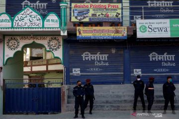 Sejumlah polisi berjaga di depan Masjid Jame saat aksi protes warga terhadap adanya Warga Negara Indonesia (WNI) di dalam masjid tersebut di Imadol, Lalitpur, Nepal, Kamis (2/4/2020). WNI yang berkunjung ke masjid tersebut dievakuasi oleh polisi setempat akibat mendapat protes dari warga sekitar di tengah kekhawatiran orang luar dapat menyebarkan virus Corona atau COVID-19. ANTARA FOTO/REUTERS/Navesh Chitrakar/wsj.