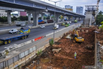Sejumlah pekerja beraktivitas di lokasi proyek Kereta Cepat Jakarta-Bandung di Bekasi, Jawa Barat, Jumat, (3/4/2020). Menurut Direktur Utama PT Kereta Cepat Indonesia-Cina (KCIC) Chandra Dwiputra proyek pembangunan fisik kereta cepat sudah mencapai 42 persen dan proses pembebasan lahan telah mencapai 99,95 persen. ANTARA FOTO/ Fakhri Hermansyah/hp.