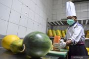 Koki memotong buah-buahan yang disediakan untuk tenaga medis dan kesehatan di hotel Cempaka, Jakarta, Jumat (3/4/2020). PT Jakarta Tourisindo menyediakan makanan untuk tenaga medis dan kesehatan yang menangani pandemi virus corona atau COVID-19. ANTARA FOTO/Nova Wahyudi/hp.