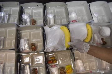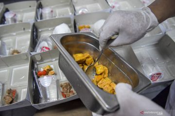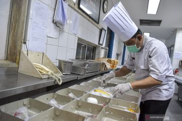 Koki menyusun makanan yang disediakan untuk tenaga medis dan kesehatan di hotel Cempaka, Jakarta, Jumat (3/4/2020). PT Jakarta Tourisindo menyediakan makanan untuk tenaga medis dan kesehatan yang menangani pandemi virus corona atau COVID-19. ANTARA FOTO/Nova Wahyudi/hp.
