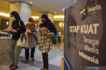 Petugas medis berjalan membawa makanan di hotel Cempaka, Jakarta, Jumat (3/4/2020). PT Jakarta Tourisindo menyediakan makanan untuk tenaga medis dan kesehatan yang menangani pandemi virus corona atau COVID-19. ANTARA FOTO/Nova Wahyudi/hp.
