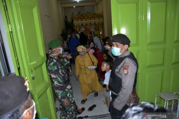 Anggota TNI dan Polri membubarkan warga yang berkumpul di acara pernikahan warga di Kabupaten Gowa, Sulawesi Selatan, Rabu (7/4/2020) malam. Patroli malam yang dilaksanakan anggota Polri, TNI dan Satpol PP tersebut untuk menertibkan warga yang masih berkerumun sebagai upaya mencegah penyebaran virus corona (COVID-19). ANTARA FOTO/Abriawan Abhe/hp.