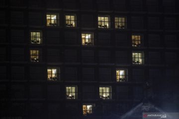Salah satu hotel menyalakan lampu kamar dan membentuk tanda cinta di Kota Bogor, Jawa Barat, Kamis (9/4/2020). Aksi solidaritas hotel tersebut menjadi simbol empati, semangat kebersamaan dalam menghadapi pandemi COVID-19. ANTARA FOTO/Yulius Satria Wijaya/hp.