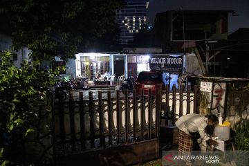 Warga Rawa Bambu beraktivitas di rumahnya dengan latar belakang lampu hotel berbentuk lafaz Allah di Jakarta Selatan, Minggu (12/4/2020). Gubernur DKI Jakarta Anies Baswedan mengimbau seluruh warga di Jakarta untuk tetap berada di rumah selama penerapan Pembatasan Sosial Berskala Besar (PSBB) guna memangkas mata rantai penyebaran COVID-19. ANTARA FOTO/Sigid Kurniawan/aww.