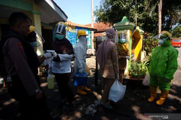 Sejumlah petugas medis bersiap melakukan pemeriksaan kesehatan pekerja pabrik kecap saat isolasi komunal di Desa Penusupan, Kabupaten Tegal, Jawa Tengah, Selasa (14/4/2020). Satgas COVID-19 Kabupaten Tegal melakukan isolasi komunal 16 orang pekerja pabrik kecap selama 14 hari akibat berinteraksi langsung dengan pemilik pabrik yang dinyatakan positif COVID-19. ANTARA FOTO/Oky Lukmansyah/wsj.
