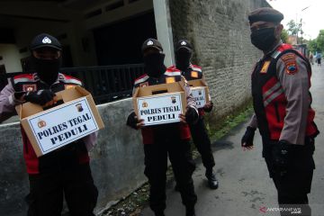Petugas kepolisian membawa paket sembako yang akan dibagikan bagi warga kurang mampu di wilayah Slawi, Kabupaten Tegal, Jawa Tengah, Rabu (15/4/2020). Pembagian paket sembako oleh Polres Tegal kepada ojek daring, juru parkir dan warga kurang mampu tersebut untuk membantu meringankan beban masyarakat yang terdampak COVID-19. ANTARA FOTO/Oky Lukmansyah/hp.