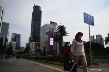 Sejumlah pekerja berjalan usai bekerja dengan latar belakang gedung perkantoran di Jl Jenderal Sudirman, Jakarta, Kamis (16/4/2020). Pemprov DKI Jakarta akan memberikan saksi berupa mencabut perizinan kepada perusahaan yang tetap beroperasi di masa Pembatasan Sosial Berskala Besar (PSBB) kecuali delapan sektor yang memang diizinkan. ANTARA FOTO/Akbar Nugroho Gumay/hp.