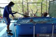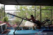 Atlet triatlon Kuba Leslie Amat berlatih di atap rumahnya di tengah kekhawatiran tentang penyebaran wabah virus corona (COVID-19), di Havana, Kuba (17/4/2020). Amat bercerita, sejak virus mewabah di negaranya bulan lalu dan otoritas menutup fasilitas kolam renang utama, dia memutuskan untuk memakai kolam renang anak-anak sepanjang tiga meter yang dipinjamkan pelatihnya. ANTARA/REUTERS/Alexandre Meneghini/aa.