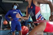 Atlet triatlon Kuba Leslie Amat menerima instruksi dari pelatihnya selama sesi pelatihan di atap rumahnya di tengah kekhawatiran tentang penyebaran wabah virus corona (COVID-19), di Havana, Kuba (17/4/2020). Amat bercerita, sejak virus mewabah di negaranya bulan lalu dan otoritas menutup fasilitas kolam renang utama, dia memutuskan untuk memakai kolam renang anak-anak sepanjang tiga meter yang dipinjamkan pelatihnya. ANTARA/REUTERS/Alexandre Meneghini/aa.