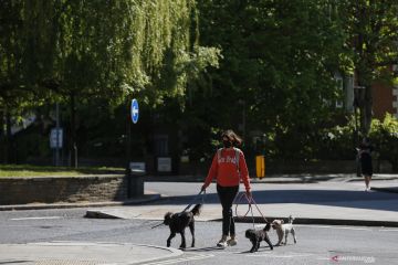 Seorang wanita yang mengenakan masker mengajak anjing peliharaan berjalan-jalan di London, Inggris, pada 21 April 2020. Sebanyak 823 pasien yang dinyatakan positif COVID-19 dilaporkan meninggal di rumah sakit di Inggris pada Senin (20/4) sore waktu setempat, menambah jumlah kematian terkait coronavirus menjadi 17.337, demikian diungkapkan Departemen Kesehatan dan Perawatan Sosial Inggris pada Selasa (21/4). Hingga Selasa pagi waktu setempat, total 129.044 orang telah dinyatakan positif COVID-19, dengan peningkatan harian sebanyak 4.301 kasus, papar departemen itu. ANTARA FOTO/Xinhua-Han Yan/hp.