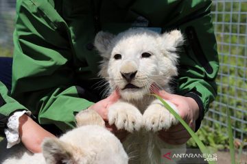 Bayi-bayi singa putih tampak bermain dengan petugas kebun binatang di luar ruangan di Taman Safari Hutan Nantong di Kota Nantong, Provinsi Jiangsu, China timur (23/4/2020). Bayi-bayi berusia hampir dua bulan itu memulai debut mereka di taman safari tersebut pada Kamis (23/4) dan mereka secara resmi akan bertemu para wisatawan pada 1 Mei mendatang. ANTARA/Xinhua/Xu Congjun/aa.