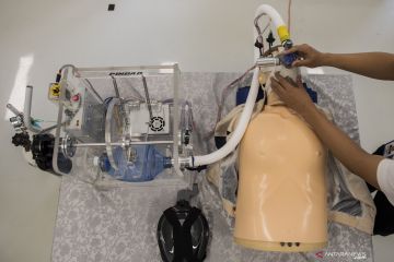 Karyawan menunjukkan penggunaan Pindad Ventilator Resusitator Manual (VRM) di Bandung, Jawa Barat, Jumat (24/4/2020). Pindad VRM yang dirancang dan dikembangkan bersama tim ahli medis dari RSU Pindad ini merupakan alat bantu pernapasan bagi pasien COVID-19 dan saat ini sedang dalam proses uji coba kelaikan ke Balai Pengamanan Fasilitas Kesehatan (BPFK) Kementerian Kesehatan. Pindad VRM ini dibandrol hanya dengan harga Rp10 juta per unit. ANTARA FOTO/M Agung Rajasa/foc.