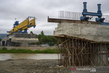 Proyek pembangunan jembatan Palu V di Palu, Sulawesi Tengah, Sabtu (25/4/2020). Pembanguna jembatan senilai Rp43 miliar dari APBD Kota Palu itu molor penyelesaiannya dari waktu yang ditetapkan dalam kontrak, yakni seharusnya selesai per 13 Desember 2019. ANTARAFOTO/Basri Marzuki/pras.